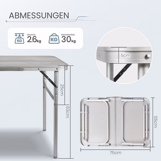 CAMPING TABLE: This ultra-light folding table made of aluminium is extremely weather-resistant and durable. It offers a generous storage area of about 75×55 cm (enough for 4 large plates), ideal for excursions and other outdoor activities. Thanks to its practical carrying function, it is easy to transport and neatly stow away. The versatile table is perfect for use in the home, garden and camping.