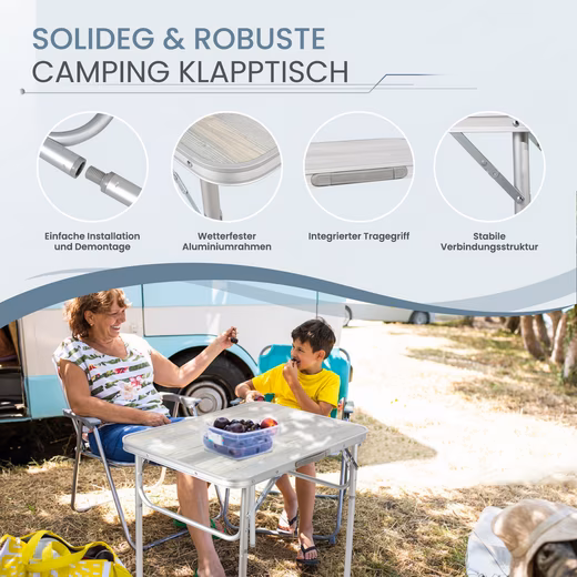 EASY TRANSPORT: The camping table is specially designed for easy transport. Due to its low weight and integrated handle, it is quickly at hand and can be moved effortlessly. After use, it can be stowed away to save space, making the folding table a real space miracle.