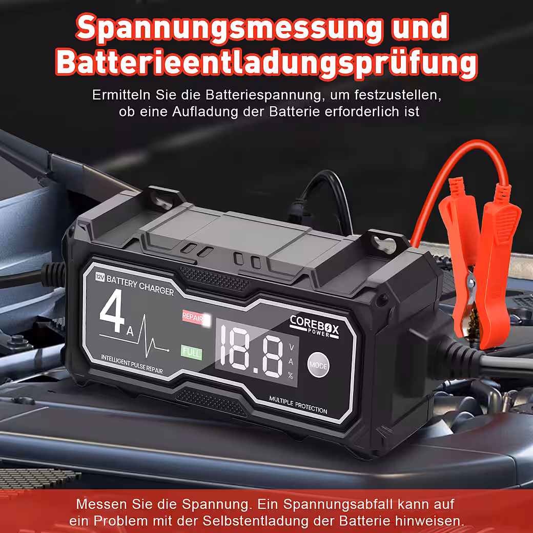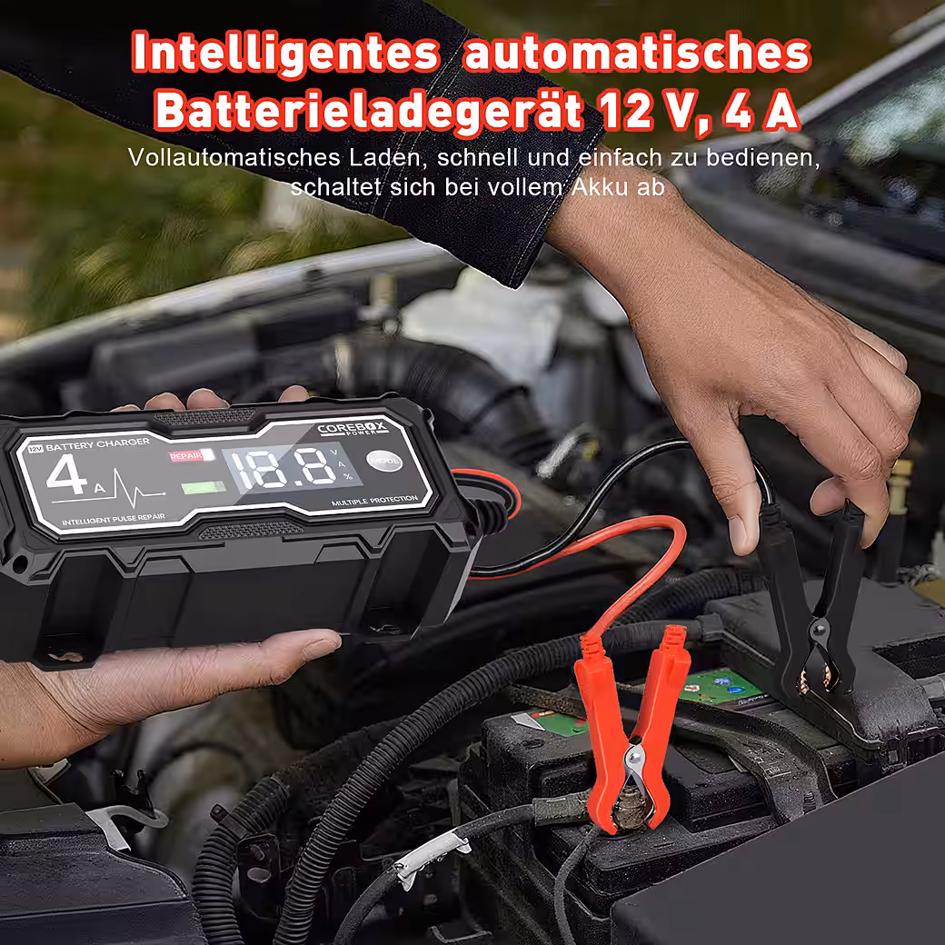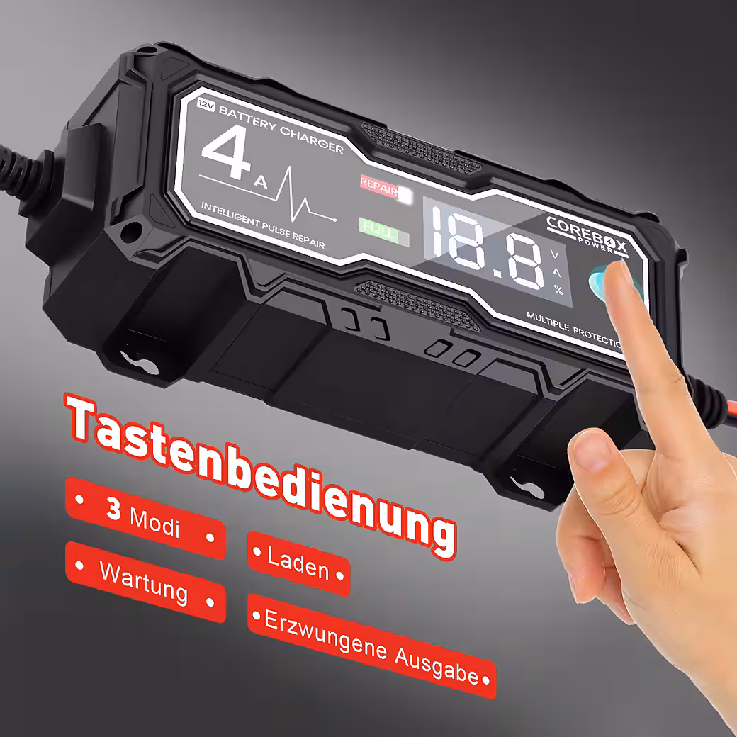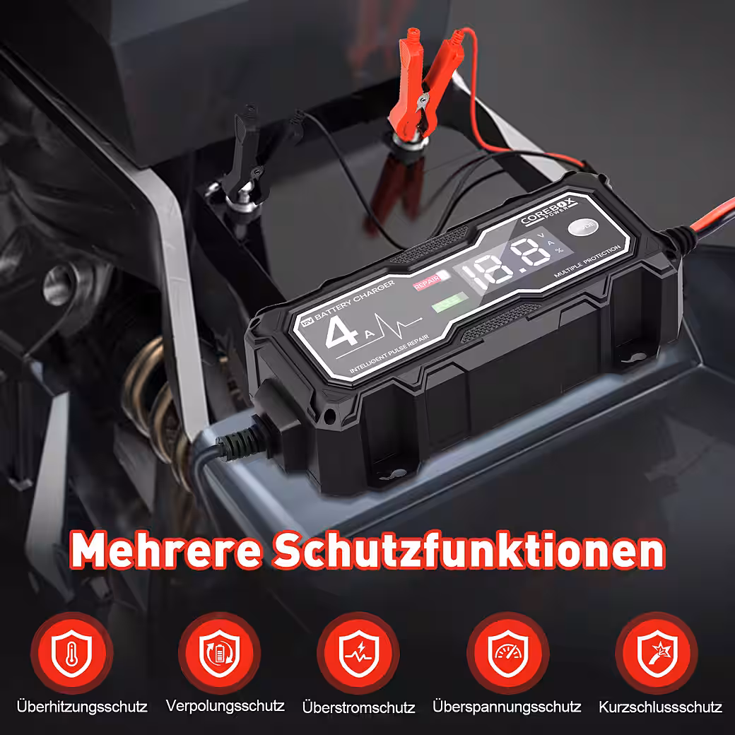 Compact and user-friendly, it ensures efficient charging and reliable battery care. It features intelligent diagnostic functions, 110–240 V operation, a memory function, three selectable charging modes, and a pulse repair function – suitable for most cars and motorcycles.