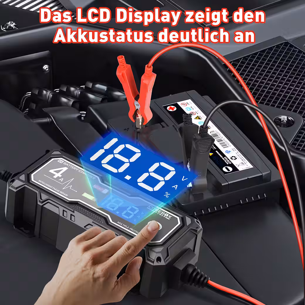 • LCD Display & Diagnostics – Clearly displays voltage, current, mode, and battery type. Reliably detects faulty batteries before charging.