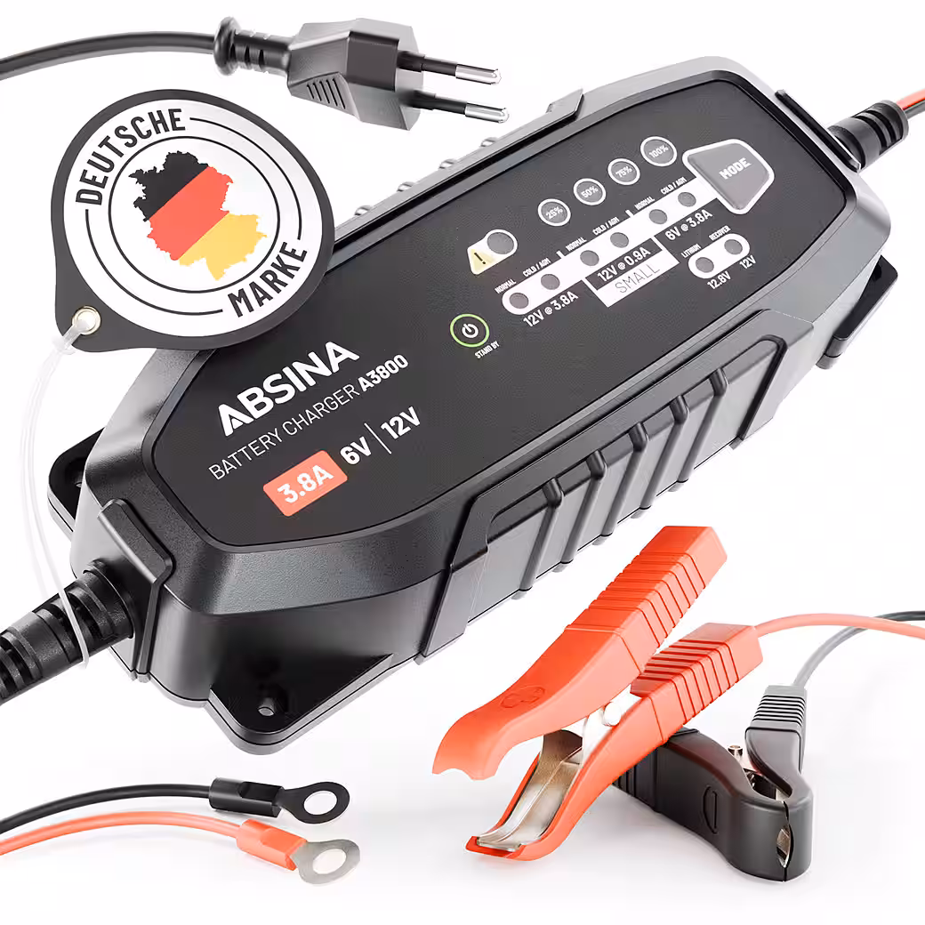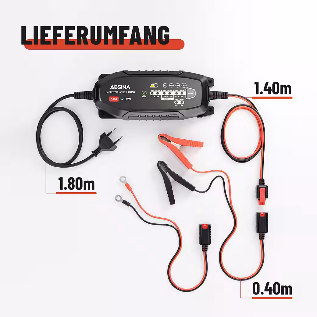 - DELIVERY includes 1x A3800 battery charger with terminal clamps & ring terminal clamps / 3.6 meter cable / LED display with charging status indicator (25/50/75/100%) / 900-3800mA charging current