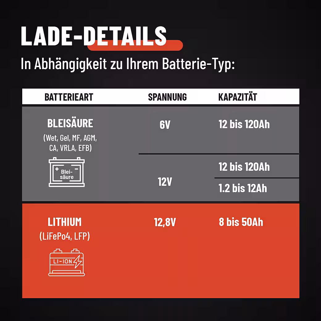 - SUITABLE FOR 6V & 12V lead-acid batteries (wet, gel, MF/maintenance-free, AGM, CA, VRLA, EFB) up to 120Ah and 12.8V lithium batteries (4-cell LiFePO4) with 8-50Ah