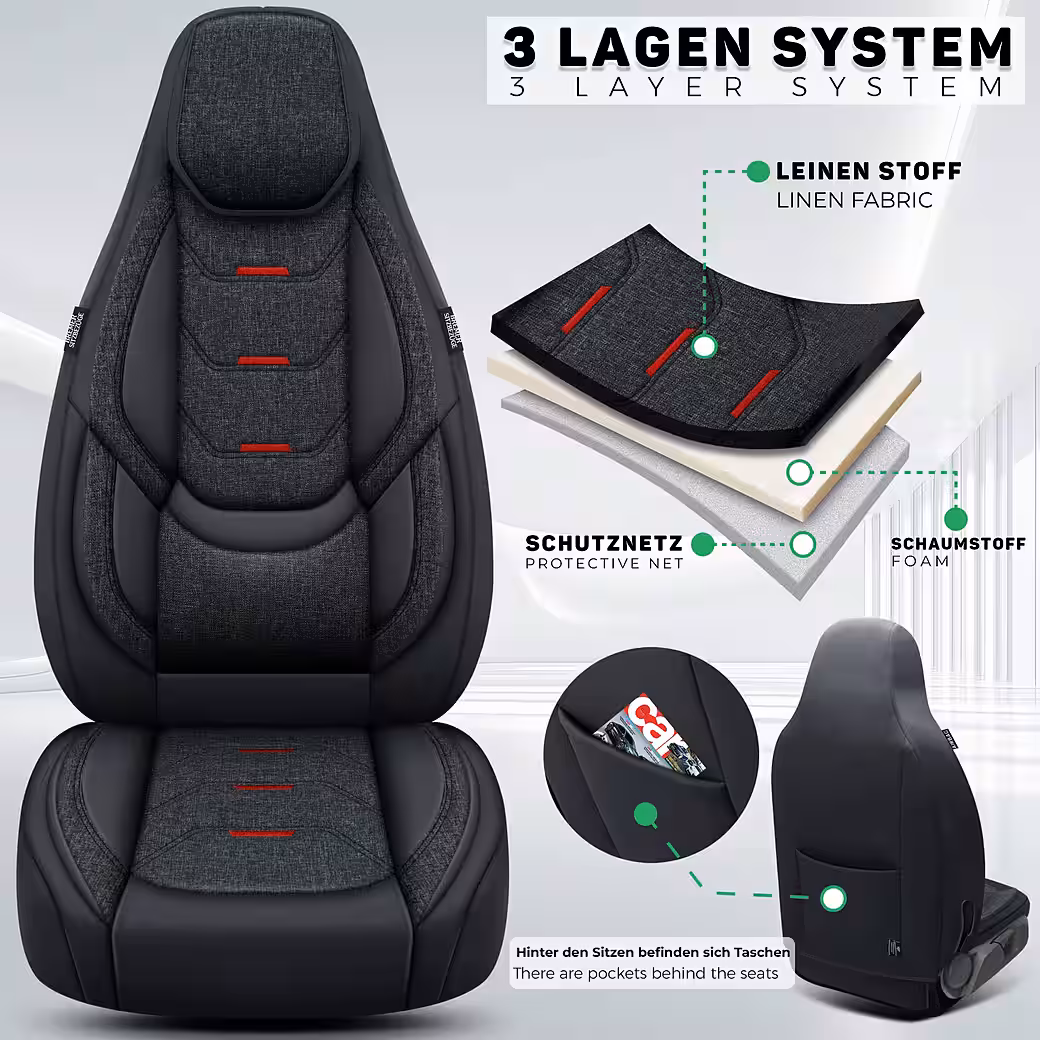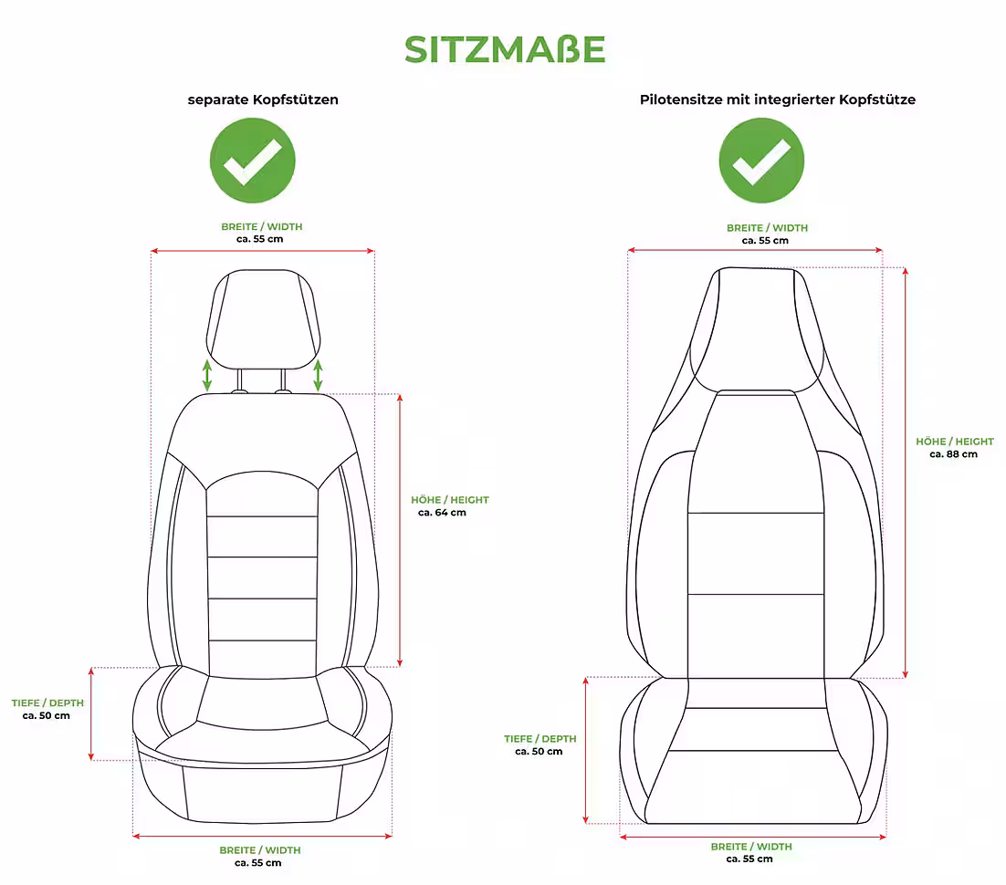 High-quality seat covers from Bremer-Sitzbezüge GmbH – over 10 years of experience in premium quality! Our custom-made car seat covers for the front seats offer a comfortable and stylish driving experience. Made from high-quality automotive-grade materials, they guarantee first-class quality and an elegant design. Easy installation: Thanks to hook-and-loop fasteners and hooks, the seat covers are easy to install – detailed instructions and a video tutorial are included. Non-slip: The covers stay securely in place, even on winding roads. Protection against wear and tear: They prevent signs of wear, stains, and dirt on your car seats, thus helping to maintain the value of your vehicle.