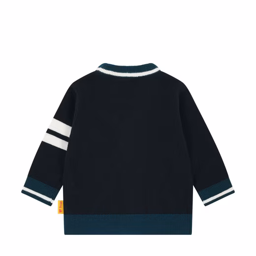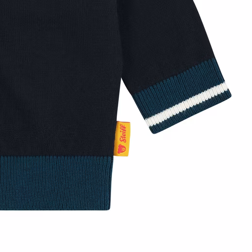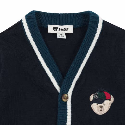 This elegant cardigan in a cotton blend is the perfect companion for stylish little charmers. The soft, fine knit feels wonderful against the skin, while the relaxed fit with a V-neck and ribbed cuffs ensures maximum comfort. In classic dark blue with contrasting green details and sporty stripes on the sleeves, it creates a modern college look. The button placket makes it easy to put on and take off. The iconic Steiff teddy bear motif with a casual cap adds a charming touch to the chest – a favorite for stylish explorers.