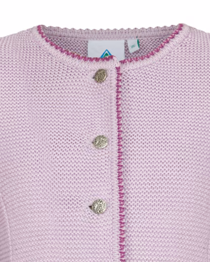 This cardigan from Isar-Trachten is a delightful piece for girls, perfect for festive occasions and folk festivals like Oktoberfest. It’s hip-length and short, featuring a beautiful knit pattern and a delicate edging of small mouse teeth along the edge, creating a colorful piping effect. It features silver decorative buttons at the front and comes in a charming lilac shade that’s ideal for pairing with dresses and skirts.