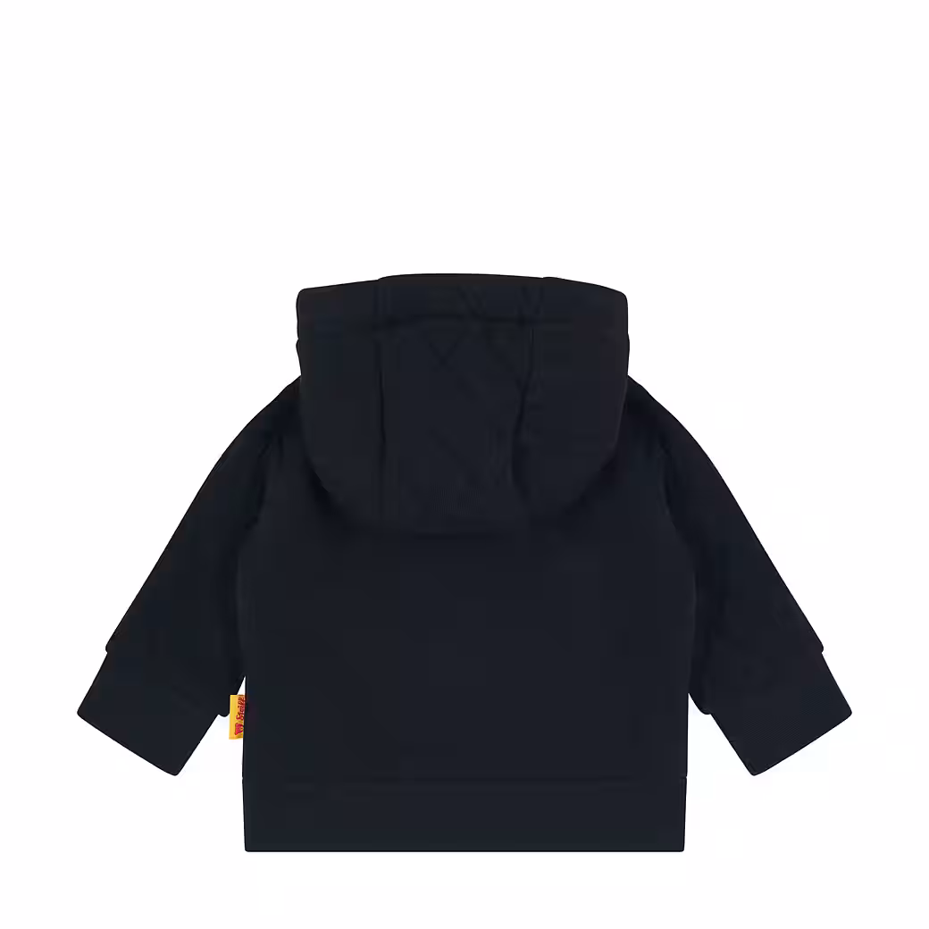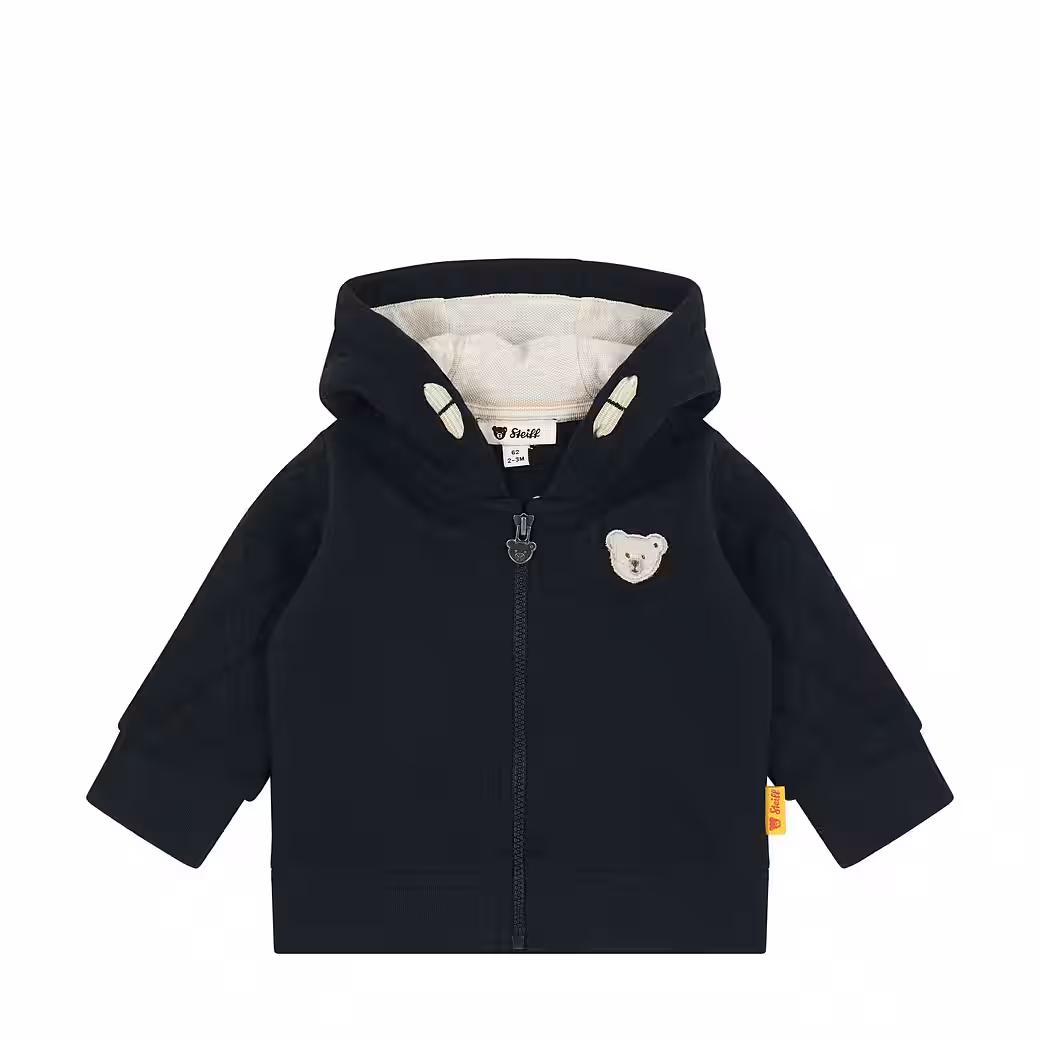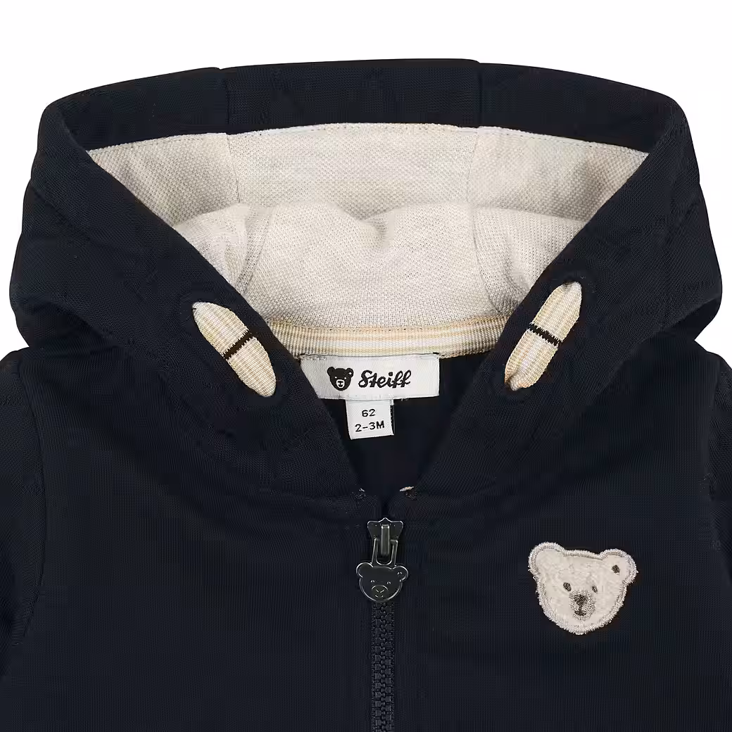 This casual sweat jacket in dark blue combines comfort and style for little adventurers, the loose cut offers plenty of freedom of movement while the quilted hood and sleeves provide a sporty look. Contrasting colored details, such as the beige inner lining of the hood, set stylish accents. The full-length zipper comes with a handy chin guard, and ribbed ends make for a perfect fit. On the chest, the classic Steiff teddy bear motif accompanies courageous explorers through everyday life.