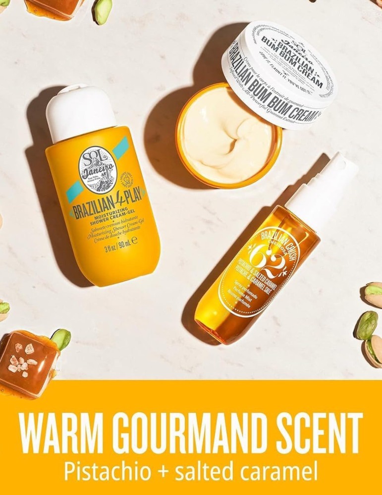 This is how summer smells: Bum Bum Jet Set by Sol de JaneiroBrazilian summer on the skin: With this great Bum Bum Jet Set, the skin is not only intensively nourished, but smells seductively smell of vanilla, pistachio and salted caramel. This irresistible aroma pampers your senses.