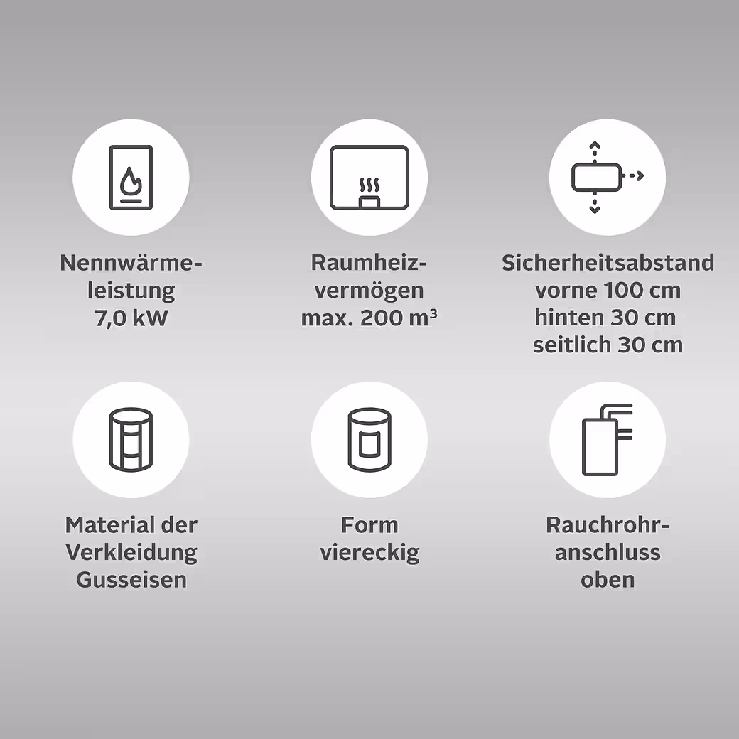 Experience the modern comfort of the Castor 85 cast iron wood-burning stove, distinguished by its all-cast iron construction. This stove features an impressive panoramic window, offering a captivating view of the blazing fire. Thanks to its robust construction and high-quality materials, the Castor 85 guarantees a long service life. The stove is suitable for logs up to 40 cm in length, allowing for flexible fuel usage. With a nominal heat output of 7.0 kW, this stove is ideal for medium to large rooms. Its high efficiency of 83.14% ensures optimal energy utilization and helps save on heating costs. The stove features an integrated airwash system, which simplifies cleaning the panoramic window and ensures a clear view of the flames. Another highlight is the cast iron firebox lining, which enables efficient heat retention and thus ensures even heat distribution. Thanks to its efficient design, no additional fine dust filter is required, which significantly simplifies maintenance and reduces operating costs. Experience the ideal combination of design, efficiency, and safety with the Castor 85 cast iron stove.