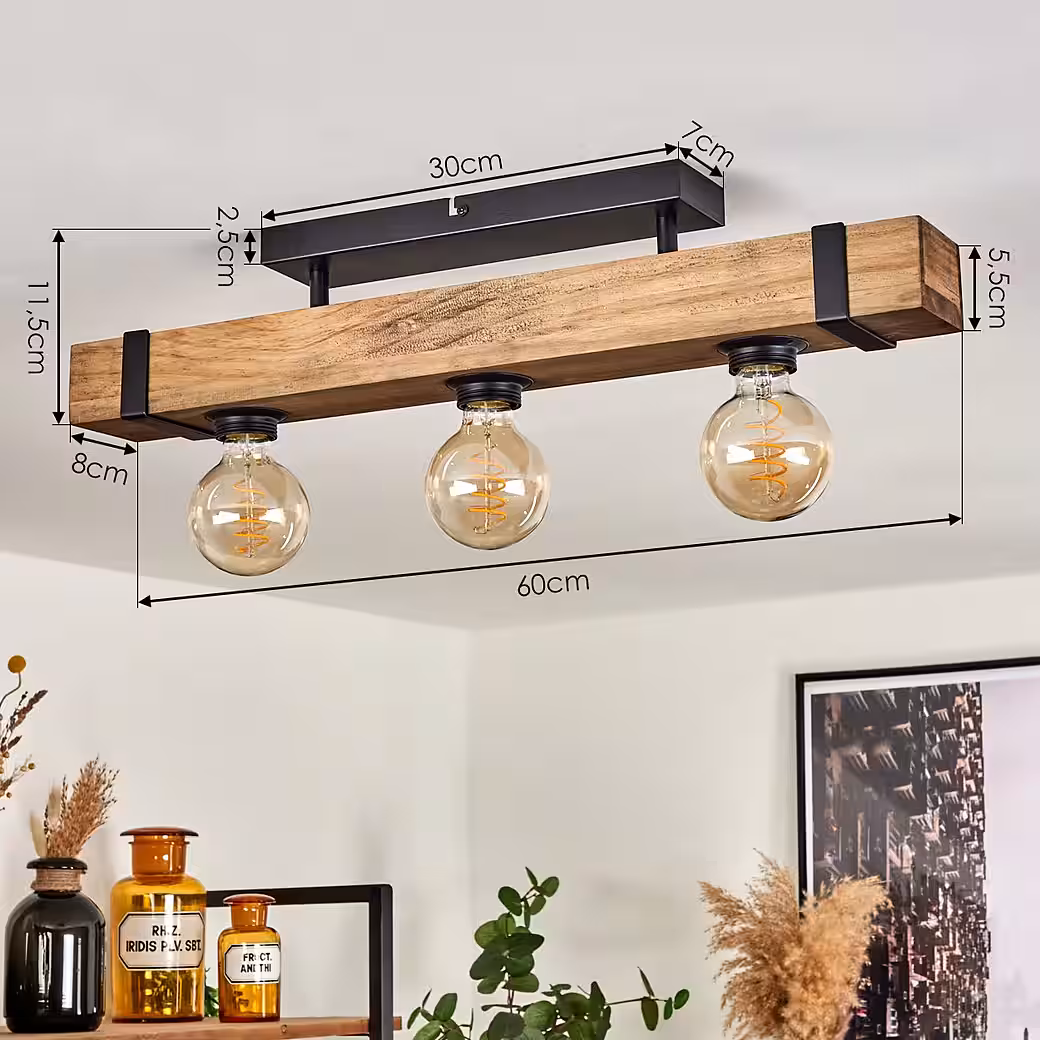 • This square, elongated ceiling light made of wood and metal blends perfectly into bedrooms and living rooms thanks to its industrial and vintage design.