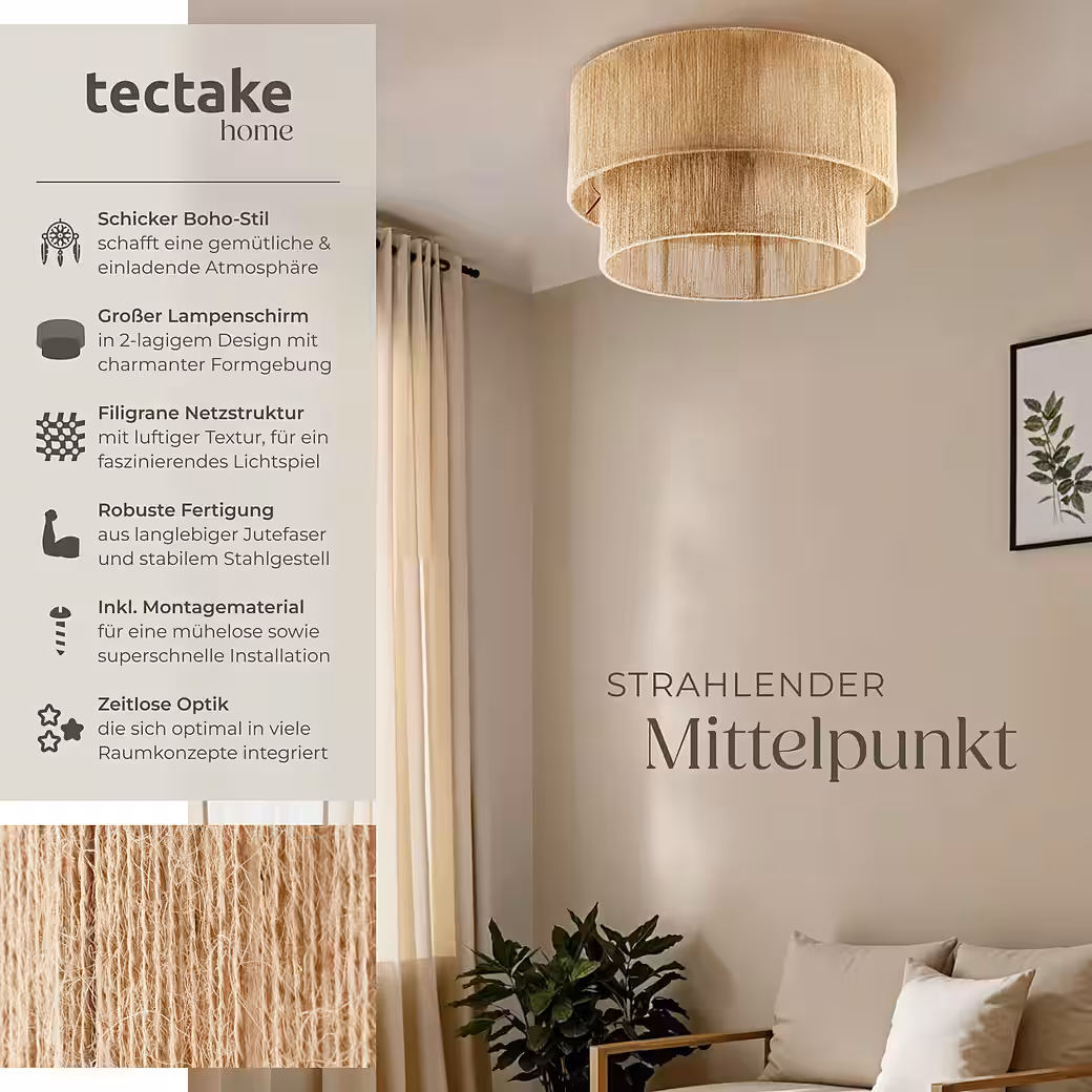 Whether in the living room, bedroom or dining area – with the Lignea Lux ceiling light made of jute from tectake you put every room in the right light.