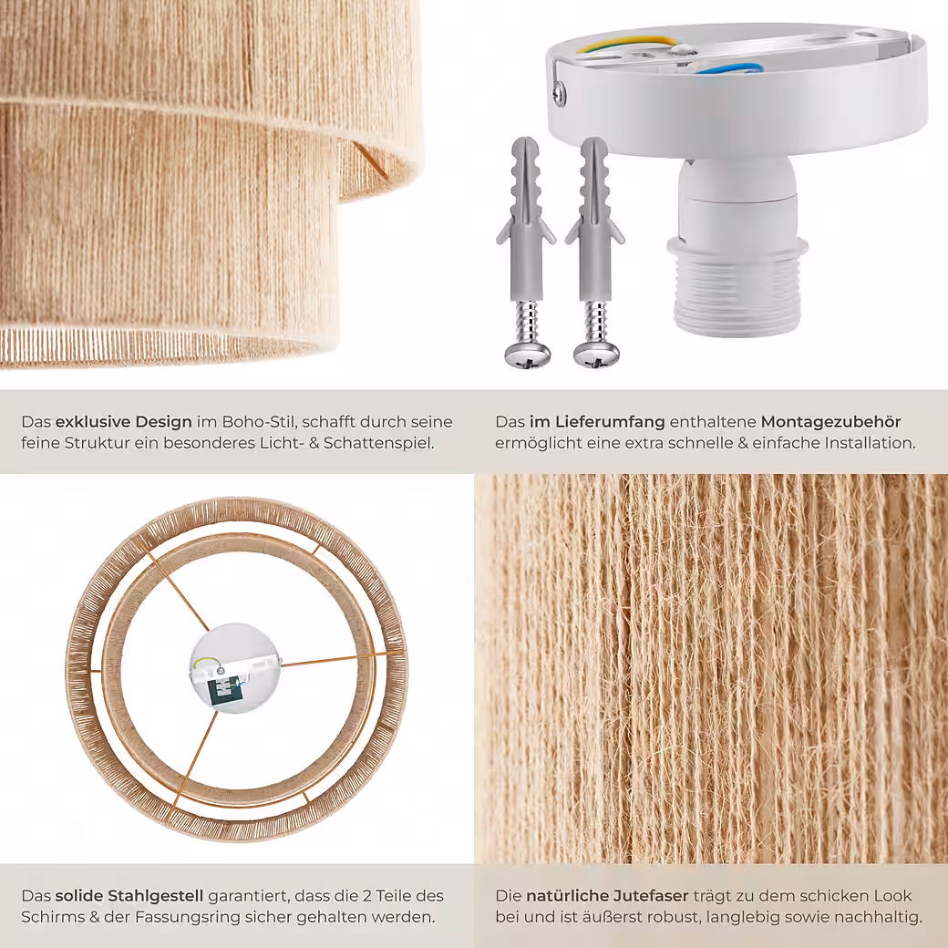 This sophisticated lampshade made of natural jute brings modern boho chic to your home and attracts attention with its unique shape. Thanks to the airy mesh structure of the fine fibers, a fascinating interplay of light and shadow unfolds, creating a cozy and inviting atmosphere.