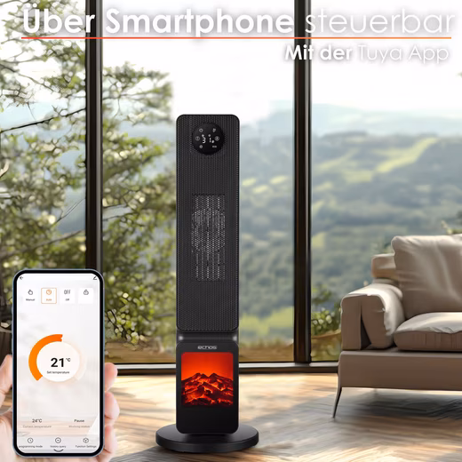 - Intelligent control with the TUYA app: Control the fan heater conveniently via your smartphone with the TUYA app. You can set the temperature, select the heat level, activate the timer and regulate the flame optics – all easily from your mobile device, no matter where you are. Thanks to the built-in WIFI function, the connection to the smart home system is seamlessly supported.
