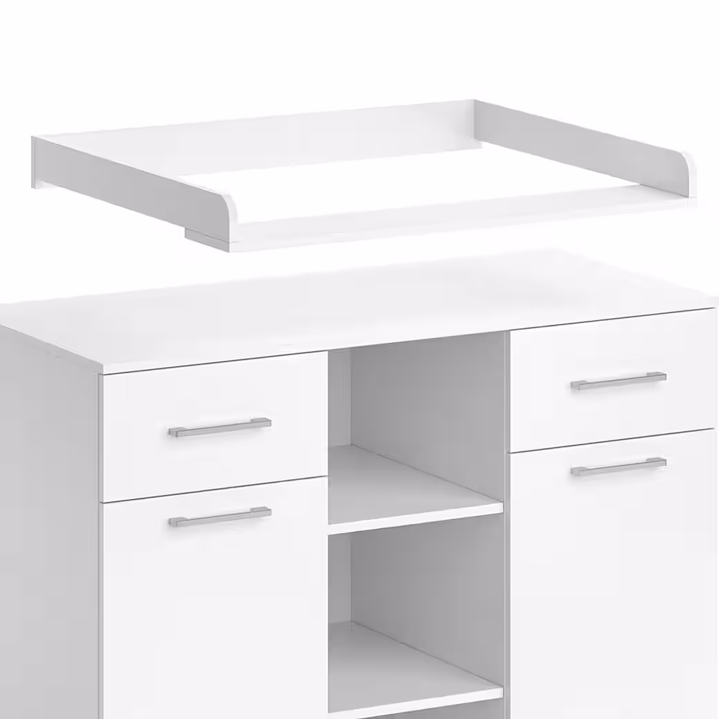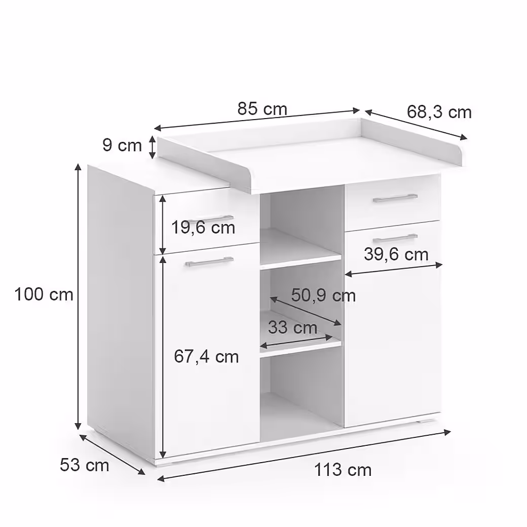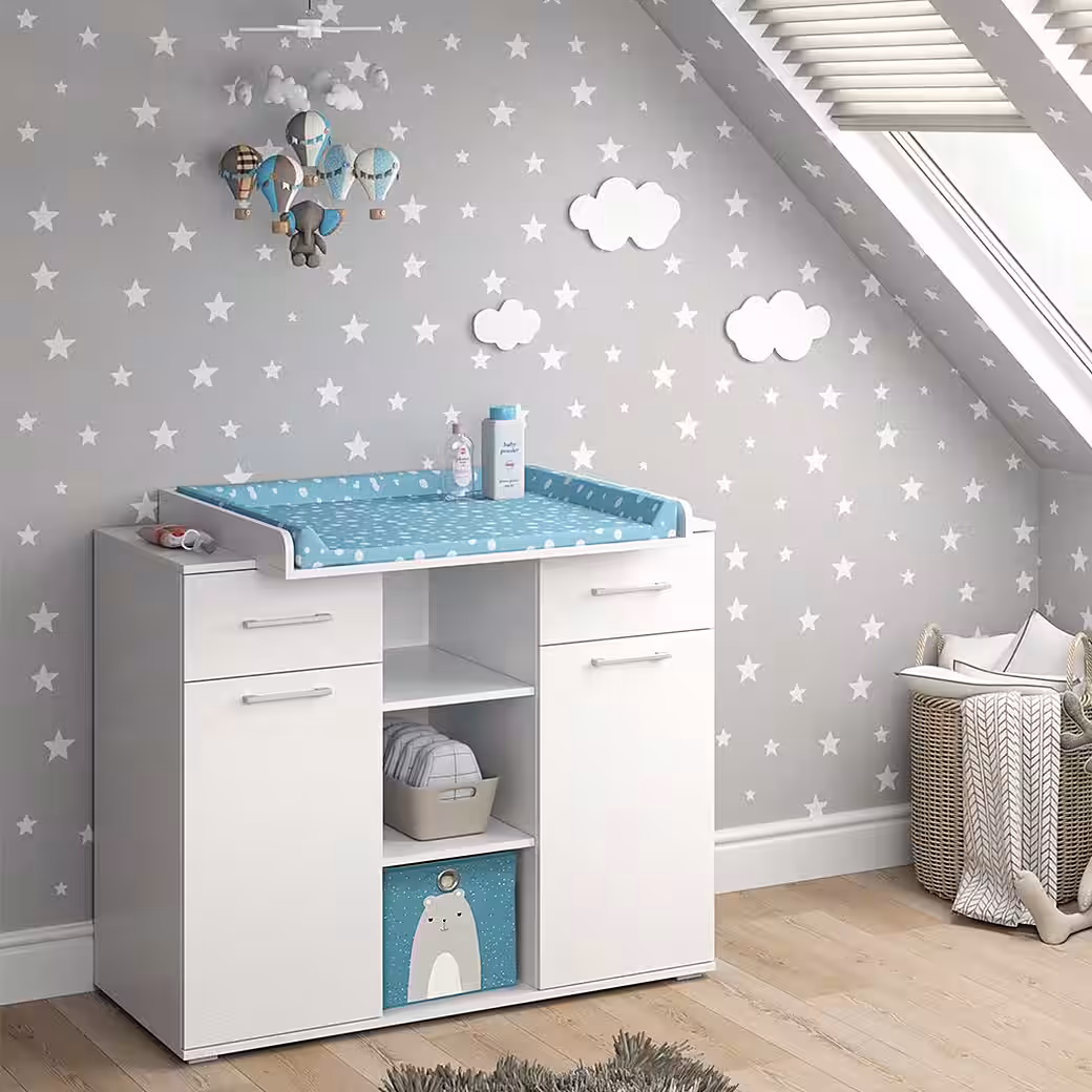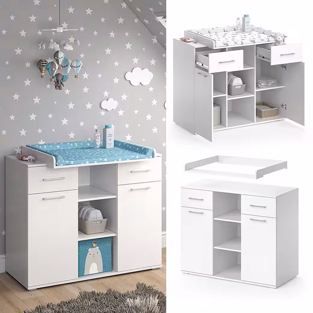 With the wrap dresser Leonie, wrapping your baby becomes a real pleasure! The functional design combines a changing chest and a living room cabinet in one, which saves space and makes your home more tidy. When your child has grown out of the diapers, the Leonie transforms into a practical chest of drawers and accompanies you and your offspring for a long time to come. The detachable and sliding wrapping surface of the Leonie offers you maximum flexibility when winding. Two cabinets, two doors and three open shelves provide sufficient storage space for all changing utensils, clothing and toys. If you need even more storage options, you can supplement the Leonie with practical storage boxes. Convince yourself of the functionality and timeless design of the Leonie wrap chest and give your baby and yourself a piece of flexibility and comfort in everyday life.—