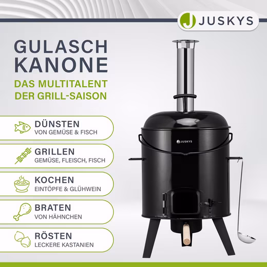 Whether grilling, cooking, frying, or roasting, this stainless steel goulash cannon lets you conjure up fantastic dishes for friends and family outdoors. Versatile and equipped, this wood-fired oven, with its large 17-liter kettle and 8-liter pan, allows you to prepare all kinds of food, from soup and roast chicken to roasted chestnuts. The oven can be operated with fire or coal and is made of robust, enameled steel. A lid, ladle, and ash pan complete this compact field kitchen.