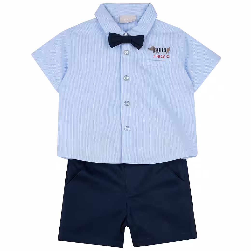 - Brand: Chicco Set: Short-sleeved shirt with bow tie & shorts Design: Light blue shirt with embroidered dachshund motif Closure: Button placket for easy dressing and undressing