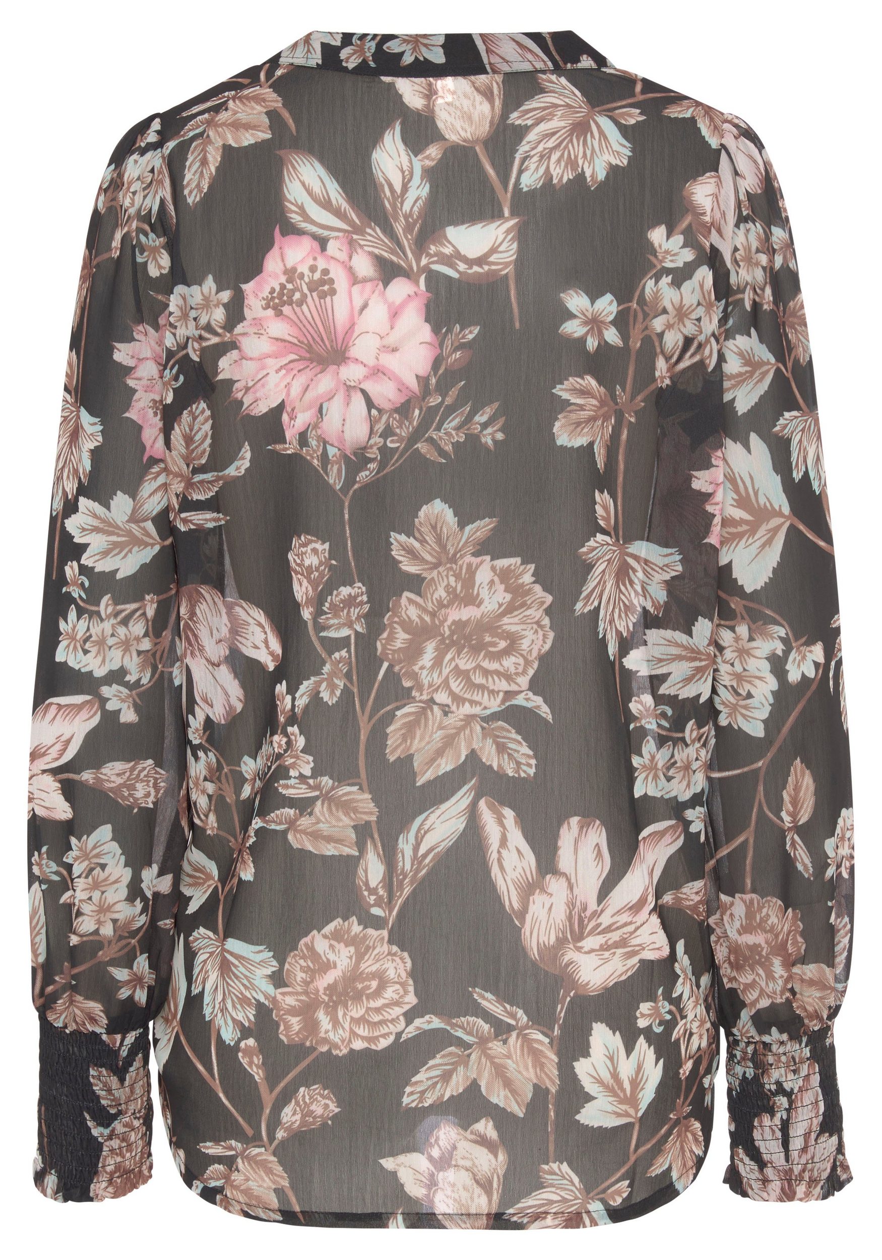 Pure elegance is the promise Lascana delivers with its latest blouse. Long sleeves combine with a V-neck with a panel and exciting smocked cuffs. The comfortable chiffon blouse, which is slightly longer at the back, reveals a touch of sheerness. It looks exciting and feels even better. A must-have pair with elegant trousers: this blouse by Lascana!