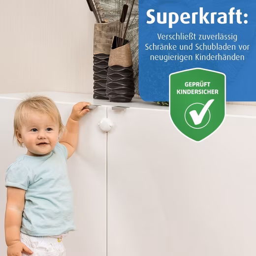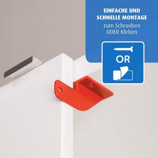 A practical wall mount keeps the lock securely stored when cabinets are open. The red indicator reminds you to reactivate the lock after use – for maximum protection of your little ones. The white design blends harmoniously into any living environment, and the high-quality material ensures a long lifespan.
