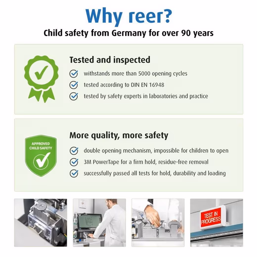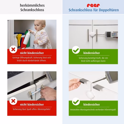 The reer cabinet lock for double doors is the perfect solution for childproofing your home. Especially for toddlers who are starting to crawl or walk, this lock offers a simple and effective way to securely close doors and cabinets. Installation is quick and easy, requiring no additional tools – ideal for busy parents.