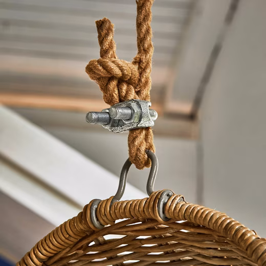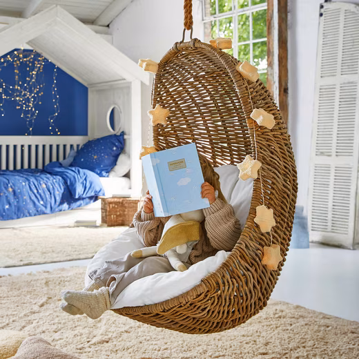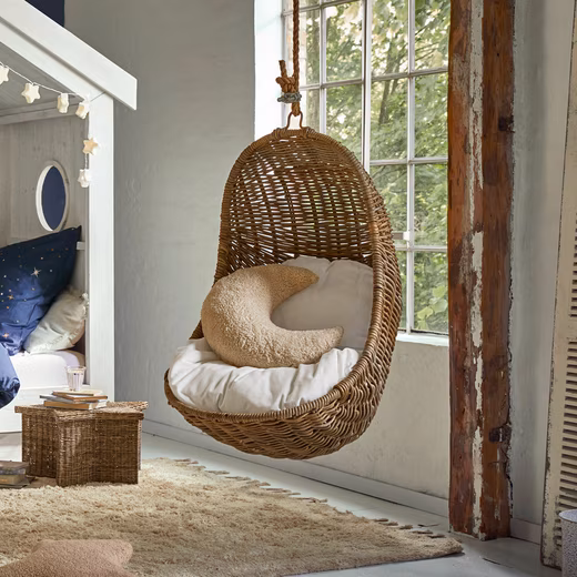 Gentle rocking for little daydreamers. Natural rattan meets cozy upholstered cushions. Easy to hang on solid jute rope. This hanging chair is a favourite place at lofty heights. The sturdy iron frame inside ensures safety, while the braided rattan brings a warm, natural touch to the children’s room. A large seat cushion makes sitting even more comfortable. The jute suspension rope adds the finishing touch to the whole thing – charming and authentic.