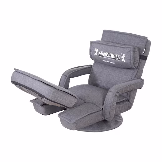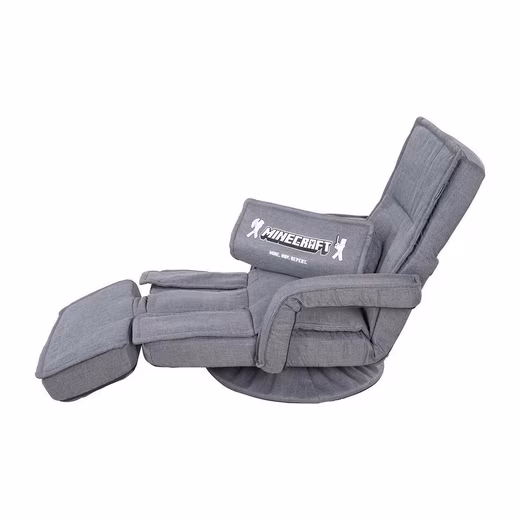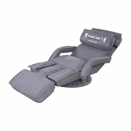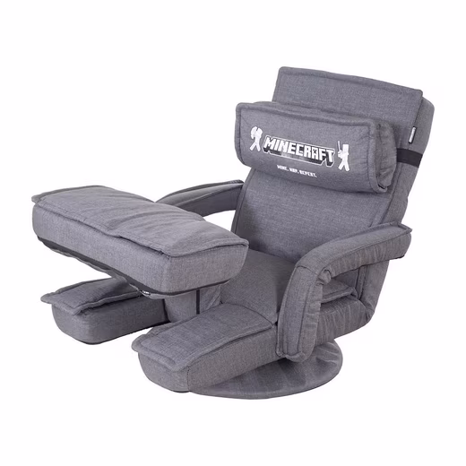 The MINECRAFT gaming chair is equipped with a grey fabric cover and a Minecraft design. It has a removable neck support and padded armrests. The backrest and leg rest are adjustable, so that a lying length of 150 cm can be achieved. The armchair can be rotated 360 degrees and can be folded up to save space.