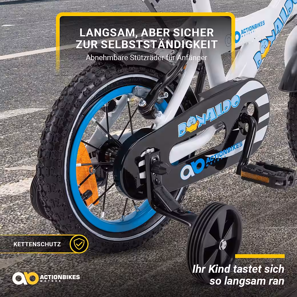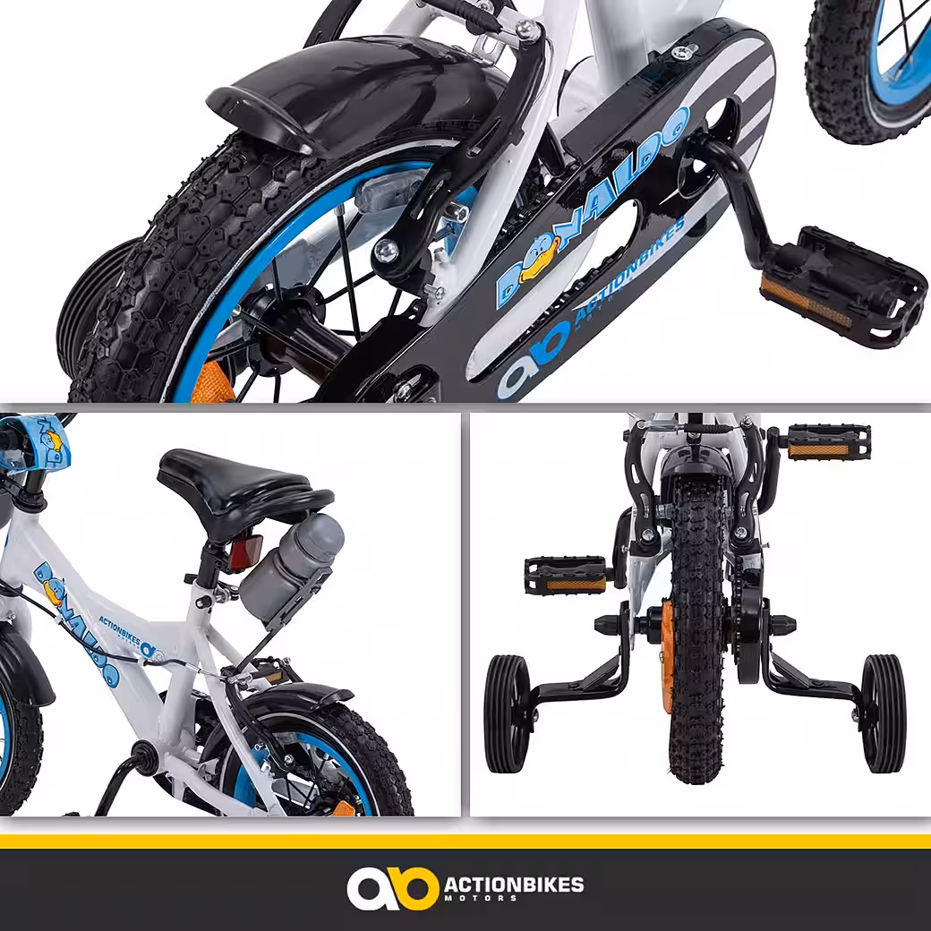 Cycling has a positive impact on children’s motor skills. Especially from the age of three, they develop abilities such as strength, endurance, and balance. The training wheels on the 12-inch Donaldo children’s bike help with this! Your child gets used to the feeling and gradually gains confidence. The handgrip on the saddle provides additional support. With enough experience, the training wheels can be removed quickly and easily. And then the real adventure begins!