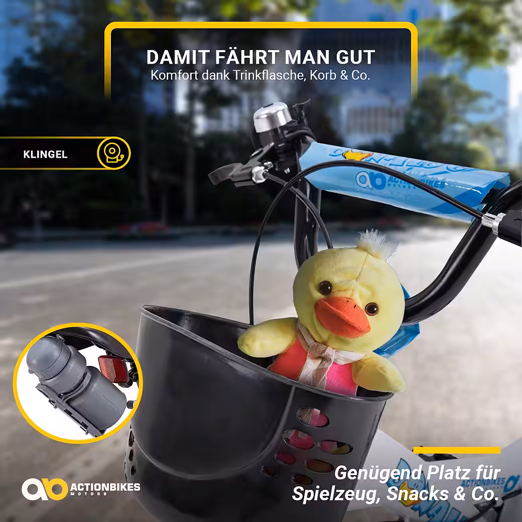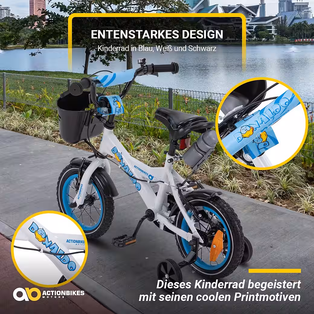 What’s that zipping around the corner? The 12-inch Donaldo children’s bike is a real head-turner. And with good reason: its unique look is striking in the clear colors of blue, white, and black. The clever duck print perfectly complements the design and lives up to the bike’s name. Removable training wheels help beginners develop their sense of balance, ensuring a successful first ride. Thanks to the chain guard and mudguards, there’s no need to stop for puddles. Instead, it’s full speed ahead! Toys, snacks, or sunscreen: the bike basket has plenty of room for all sorts of things on the go . Kids can even store their favorite drink in the additional holder. Effective V-brakes provide reliable stopping power . So what’s stopping you from a great adventure? Let’s go!