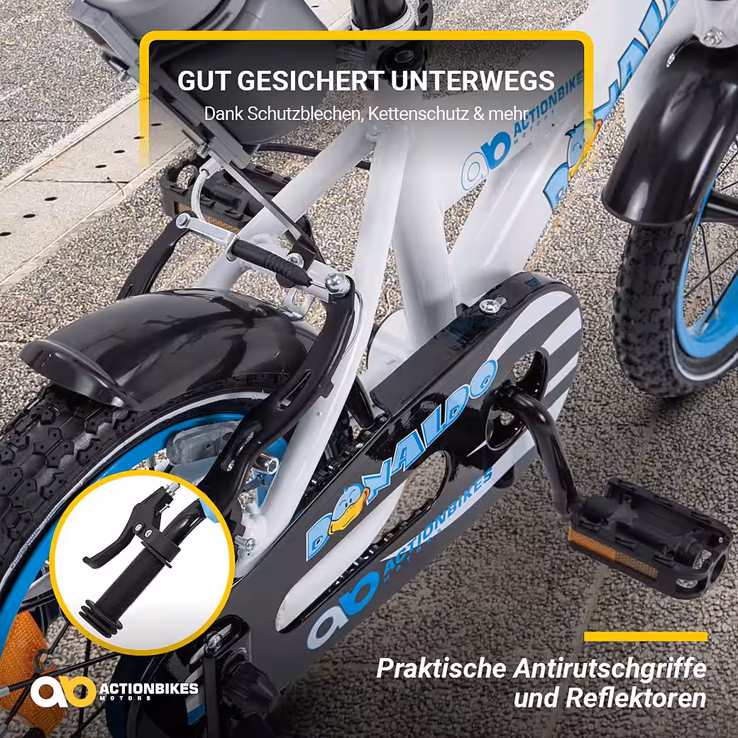 Mud, water, rain, and slush: nothing can harm the 12-inch Donaldo children’s bike! Front and rear mudguards and a chain guard ensure this . The sturdy, non- slip grips always stay firmly in your child’s hands. Essential for a balanced ride! Thanks to the reflectors , the bike is visible to children even from a distance. And with the handbrake , kids can bring the 12-inch children’s bike to a safe stop