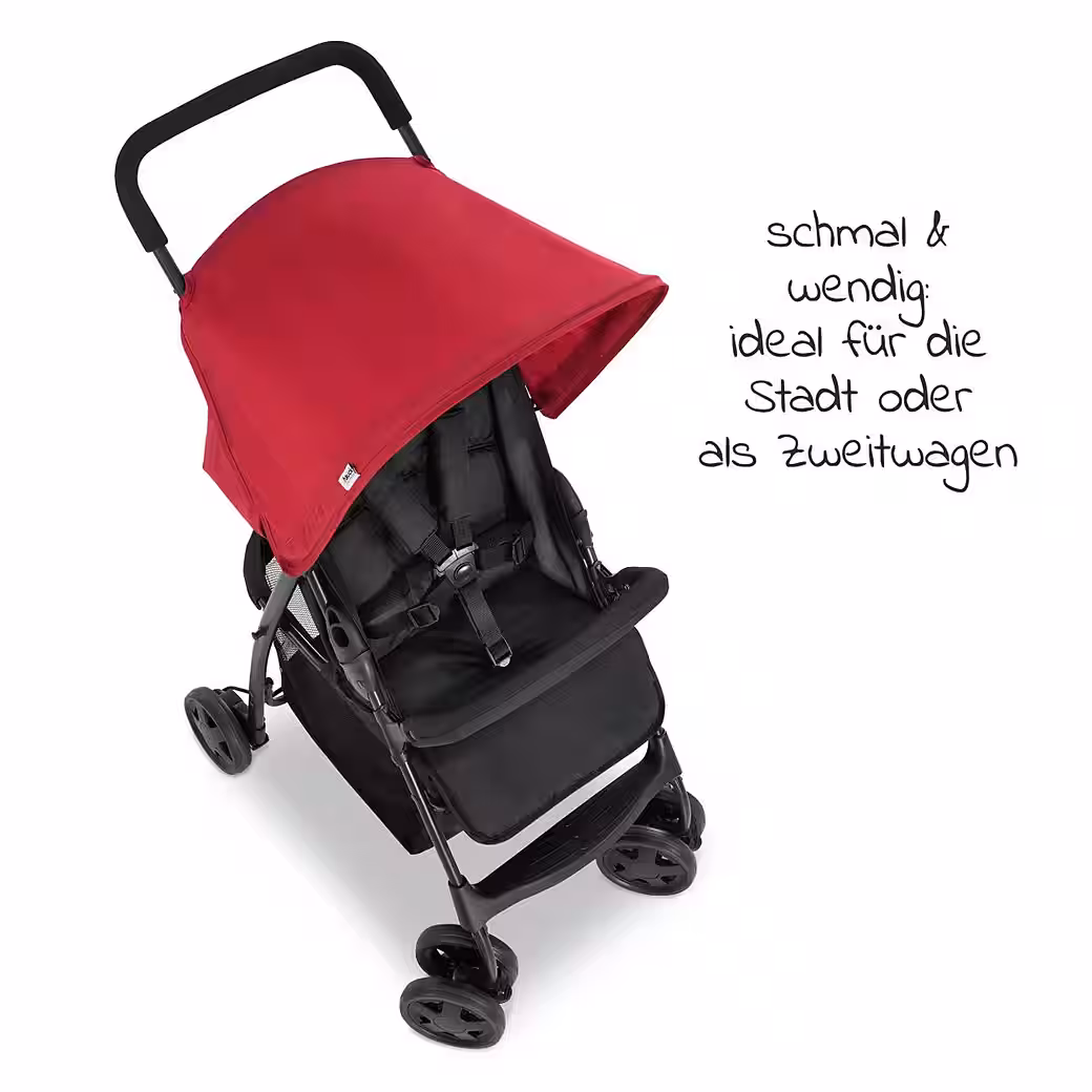 Safe & comfortable on tourThe Hauck Sport is equipped with a 5-point harness and a safety bar. The padded backrest, seat, and footrest make the buggy particularly comfortable. Little feet can easily be put up on the 4-position adjustable footrest. Thanks to the harness, the child won’t slip out.