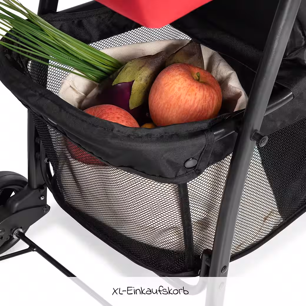 The fold-forward and backward-folding canopy provides shade and protection from rain and wind. Essential accessories for on the go or shopping can be stored in the spacious XL basket under the seat.