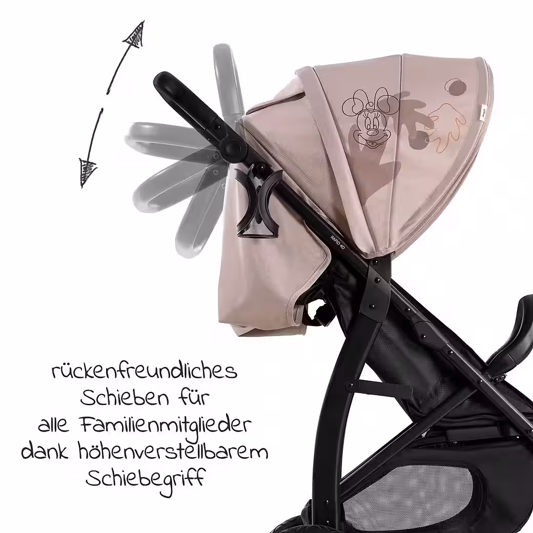 The height-adjustable push handle with drink holder is ideal for back-friendly pushing for parents of different heights.