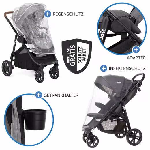 | Scope of delivery | Joie Buggy & Stroller Versatrax in Pebble Seat Unit Bumper Bar Rain Cover Insect Net Sun Canopy Cup Holder Shopping Basket Adapter |