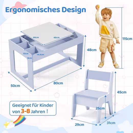 - Ergonomics & Space:Â Table size 80 x 48 x 50 cm and chair size 29 x 31 x 45 cm allow enough space for drawing, learning and playing, while the backrest supports a healthy posture.