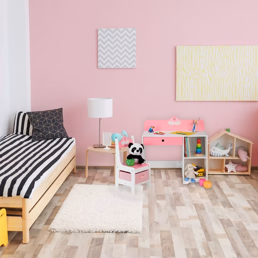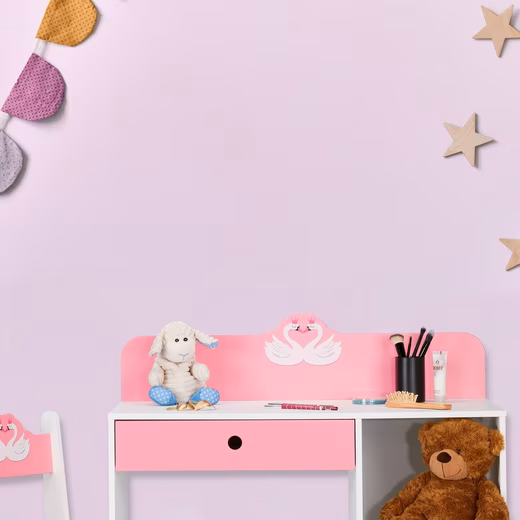 Whether for homework or handicrafts, your child will love the children’s room furniture too. Books and toys can be stowed away in the open compartments, while pens and other small items disappear in the drawer of the children’s desk. The cute swan design continues with the accompanying children’s chair. This also offers additional storage space with a small shelf including a storage box. The student desk is suitable for children between 4 and 9 years old.
