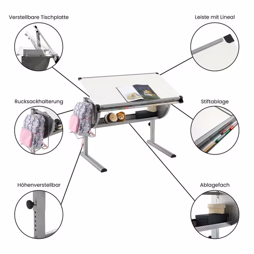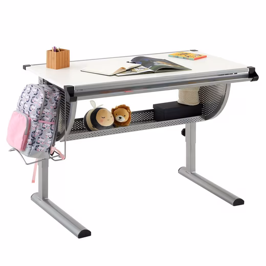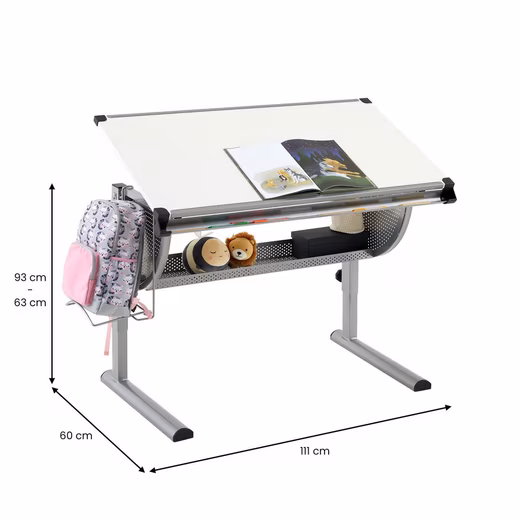 makes children’s eyes light up. Thanks to the height- and tilt-adjustable tabletop, the desk promotes an ergonomic posture of the child. This reduces the risk of posture problems or back pain and makes learning, crafting and reading more fun. The large worktop and the spacious shelf underneath offer plenty of space for school books and learning materials.