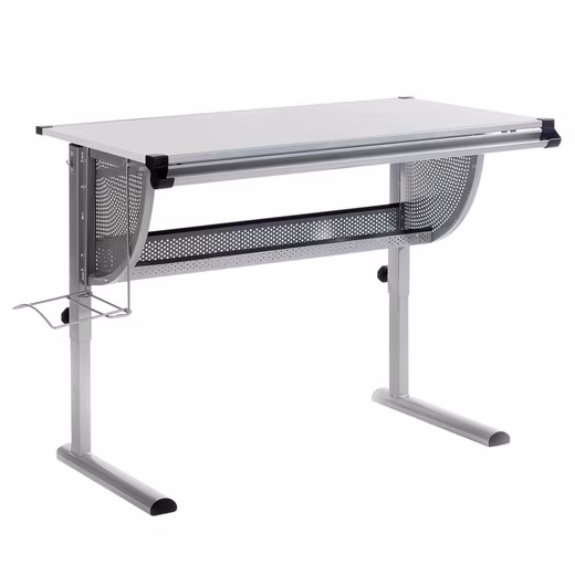- The student desk is equipped with an aluminium-coloured lacquered metal frame as well as a melamine-coated and white lacquered worktop.