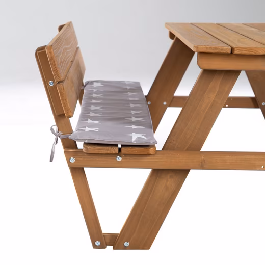 With the roba children’s outdoor seating set “Picnic for 4 with Backrests” from the “Outdoor +” series, made of high-quality solid wood, your next party will be a hit with the kids – whether outdoors in the garden, on the patio, or indoors! This weatherproof, robust, varnished seating set with practical backrests is designed with children in mind, featuring a seat height of approximately 27 cm. It is particularly durable and offers space for up to four children. The rounded corners of the play table and the stable construction ensure optimal safety. The tabletop (approx. 89/35 cm) is perfect for picnics, drawing, crafting, and playing. The benches and table of the seating set are connected, making it very stable and tip-proof. Furthermore, the seating set has no pinch points that could injure little fingers. The children’s outdoor seating set can support a weight of 50 kg per bench and tabletop. This patented children’s seating set can be complemented with practical accessories from our outdoor range and is a highlight in the garden, on the patio, or indoors. The solid wood children’s outdoor seating set is delivered disassembled. The clear assembly instructions allow for easy self-assembly. All materials used are tested for harmful substances and certified. They are also regularly inspected during production. The surfaces of the roba ‘Picnic for 4’ Outdoor+ children’s outdoor seating set are easy to clean and washable. The assembled dimensions of the set are approximately 89/107/50.5 cm (W/D/H). The entire roba Outdoor+ collection has been designed with a focus on stable construction. All Outdoor+ products are made of robust solid wood. The Outdoor+ collection is weather-resistant and particularly durable. Includes two seat cushions for the benches in the “Little Stars” design.