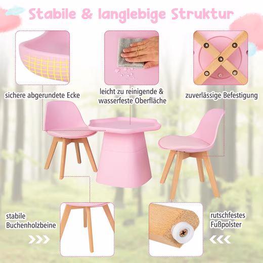 Our 3-piece children’s table and chair set includes a flower-shaped table and two chairs. The tabletop features a raised edge to prevent small items like puzzle pieces and crayons from falling off. The chairs have ergonomic backrests and soft seat cushions, providing comfortable seating and helping to develop good posture. Made from high-quality PP material and solid beechwood legs, this children’s table and chair set is sturdy and durable for children’s play. Assembly is easy with the included instructions and hardware. This children’s table and chair set is suitable for various settings, such as home, daycare, kindergarten, and more. It makes a perfect gift for children.