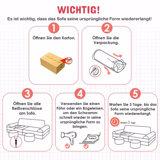 This fold-out children’s sofa is specially designed for children and comes vacuum-packed. Once unpacked, unfold completely and let rest for 3 days until the car seat regains its original shape. A steam iron will help restore foam thickness and eliminate wrinkles.
