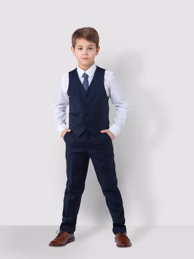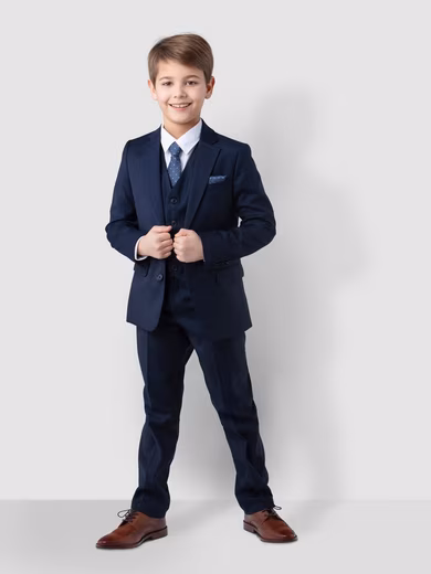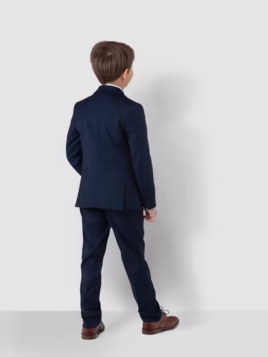 This 6-piece slim-fit boy’s suit in dark blue combines classic elegance and modernity. This children’s suit impresses with its first-class quality and comfortable cut and can be worn for all special occasions, such as communions, weddings, birthday parties, or school enrollments. The slim-fit blazer features double front pockets and a breast pocket, two center buttons, and button cuffs. The interior of the blazer is fully lined and finished with inside pockets and stitching along the lining edge. The fully lined slim-fit waistcoat has double pockets, center buttons, and an adjustable strap at the back. The slim-fit trousers feature an adjustable button waistband, belt loops, a zip fly, and a button closure. The white cotton-blend shirt features a breast pocket and two cufflinks. The handmade pre-tied tie and matching pocket square complete the outfit. Suit material: 80% polyester, 20% viscose. Shirt material: 65% polyester, 35% cotton.