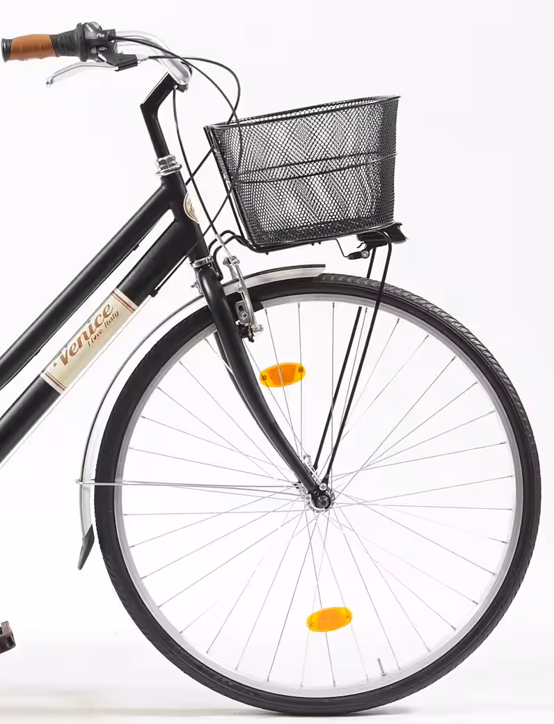 The Via Veneto 605 Lady is a simple and elegant city bike with a beautiful retro design. It is equipped with LED lights, a modern derailleur, a rear rack, and modern and reliable aluminum V-brakes. Shopping or other small items can be conveniently carried in the bag on the rear rack or in the basket on the front rack. A timeless bicycle with an Italian design for leisurely city rides