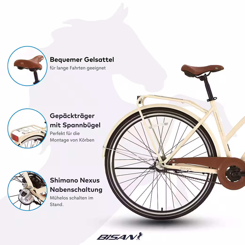 The SERENITY combines elegant design with a robust frame made of high-quality steel, guaranteeing stability and exceptional durability. Front V-brakes ensure safe and reliable braking in all situations. Equipped with the NEXUS SL-3S41E gear system, this city bike offers smooth and precise shifting – ideal for urban riding and short commutes. This bicycle is the perfect blend of style and functionality and will reliably accompany you through your daily life.