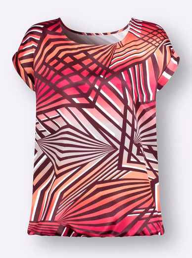 Wow, this blouse is at the top of the trend podium. Its unique print, matte satin quality, and figure-flattering cut with a comfortable round neckline and dropped shoulders with a fixed turn-up are impressive. The elastic hem allows the fabric to drape loosely over the tummy.