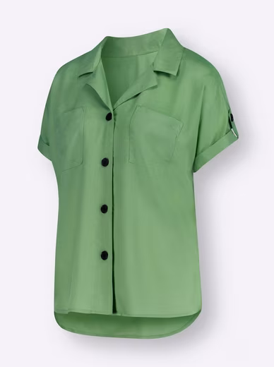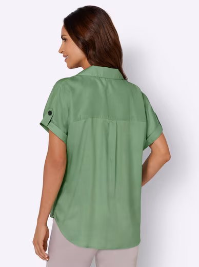 Fashionable blouse in a smooth, flowing fabric. Featuring a sleek lapel collar, button placket, dropped shoulders, and a fixed turn-up with a tab and button at the cuffs. Patch breast pockets. A box pleat below the back yoke adds width. The rounded hem is cut longer at the back.