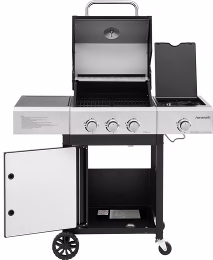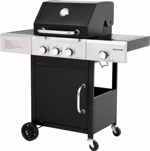 Discover the compact and functional gas grill from Hanseatic – your ideal partner for uncomplicated and enjoyable grilling moments! This gas grill combines versatility in a space-saving design. With three powerful 3 kW stainless steel main burners and an additional 2.5 kW side burner, it offers you the opportunity to prepare delicious meals for family and friends on the 48 x 42 cm cast iron grilling surface. The stainless steel warming rack ensures that your food stays at the perfect temperature until serving.The intuitive automatic ignition and the ABS rotary knob on the stainless steel control panel make operation very convenient. With two braked casters and two additional wheels, the grill can be moved effortlessly and positioned securely, while the double-walled lid ensures optimal heat insulation.