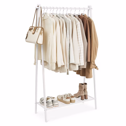 - Clothes rail for hanging garments of varying lengths; shelf for placing boxes or baskets; additional space at the bottom for storing shoes.