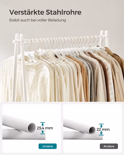 - The coat rack is made of reinforced steel tubes and is robust and stable. The clothes rail can hold up to 40 kg and the shelf up to 15 kg.