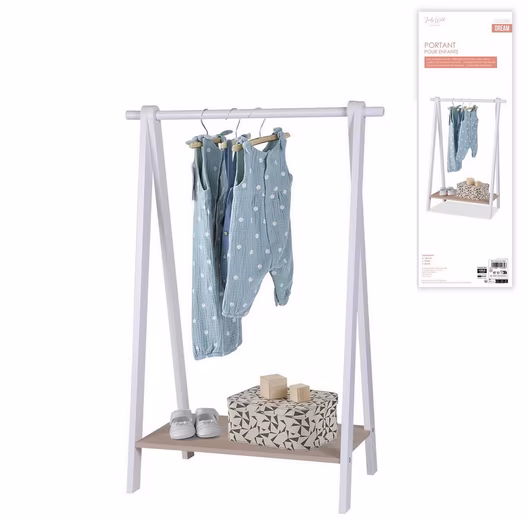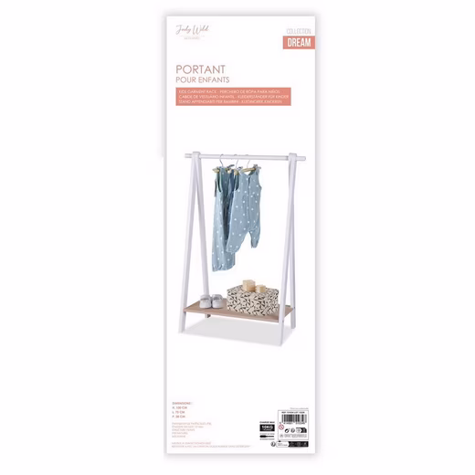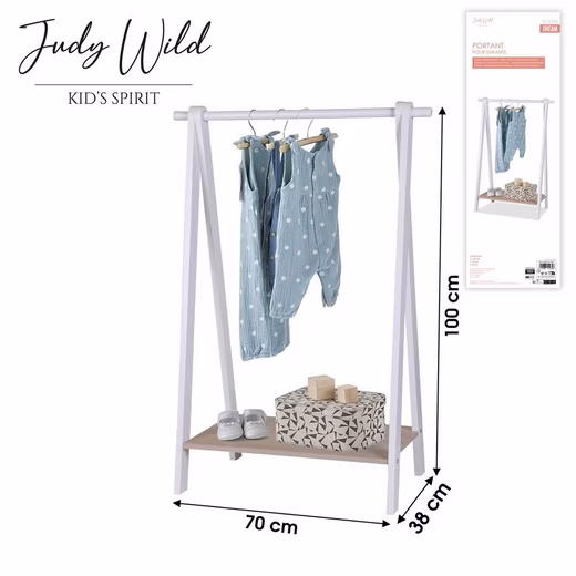 The Judy Wild children’s clothes rail from the DREAM Collection is the perfect solution to organize your child’s clothes and accessories neatly and stylishly. With its dimensions of 70 x 38 x 100 cm, it fits easily into any children’s room and offers enough space for clothes, bags and shoes.