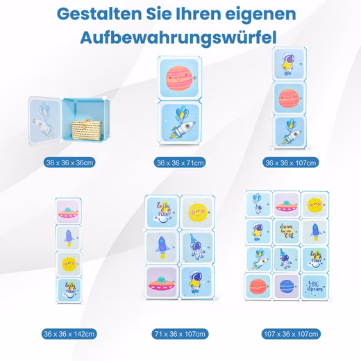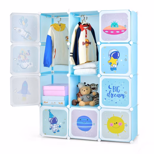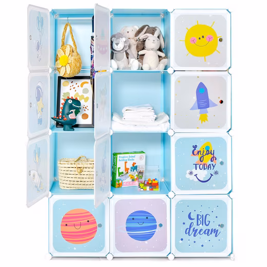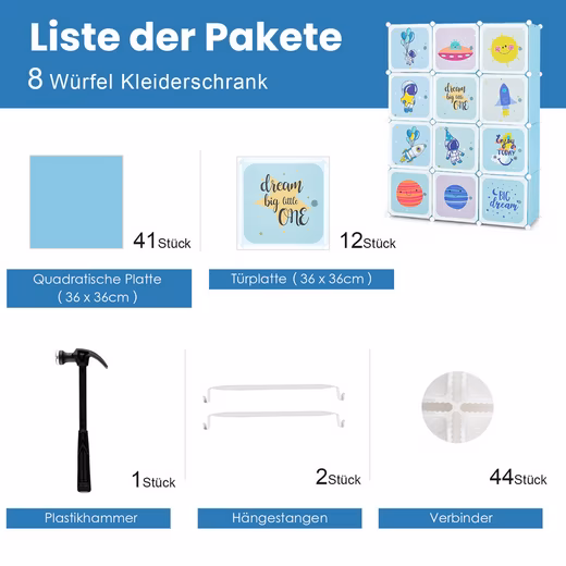 Product: Organize and sort your stuff with our 12-cube organizer! The combination of high-quality PP material, metal construction, and plastic connectors ensures the durability and stability of this modular storage shelf. This children’s storage organizer offers plenty of storage space to store small items and keep your room tidy, and even offers an area for hanging clothes. The storage cube can be divided into individual units, so you can shape it into your favorite shape as you wish. The doors of the children’s closet are finished with a cute pattern, which not only hides clutter, but also beautifies the room. Thanks to the instructions and a handy hammer, this shelf is easy to assemble and disassemble. The waterproof surface is also easy to clean.