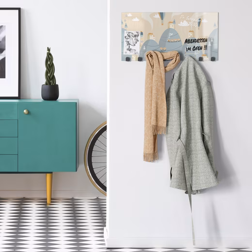 An ideal addition to the home is the 60 x 30 cm coat hook with an unusual design motif. But not only convincing as wall art and jacket holders, but thanks to the magnetic and writable properties, notes or photos can also be placed on the panel. The bulges at the back ensure that the glass coat rack is quickly attached to the wall.