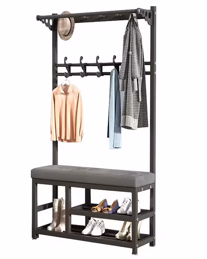 The rustic finish, matte black frame and grey shoe bench will delight you!
